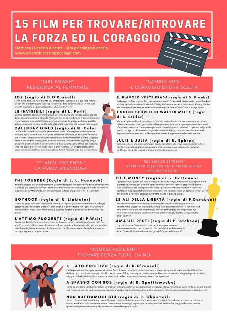 Elena non era abituata a guardare i film da questo punto di vista e mi ha chiesto di proporre alcuni esempi in cui la cinematografia ci può aiutare a trovare/ritrovare la carica. È stato un esercizio molto utile, per me, perché mi ha permesso di ragionare su “quel qualcosa” e dargli un nome. Ho creato una lista di 15 film adatti a diverse circostanze in cui possiamo sentirci senza forza, abbattuti, demoralizzati…